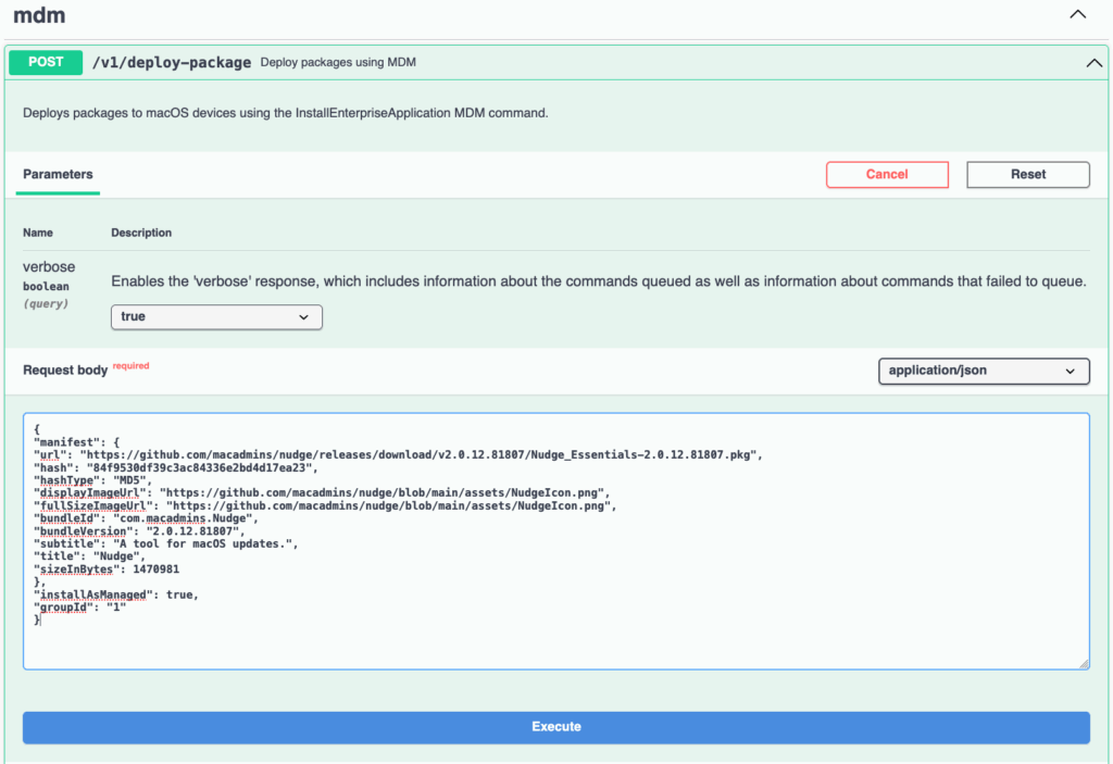 I can copy and paste this manifest into the Jamf Pro Swagger UI or write a script and include this to push Nudge to my smart group. The API command we are using is listed under “mdm.”